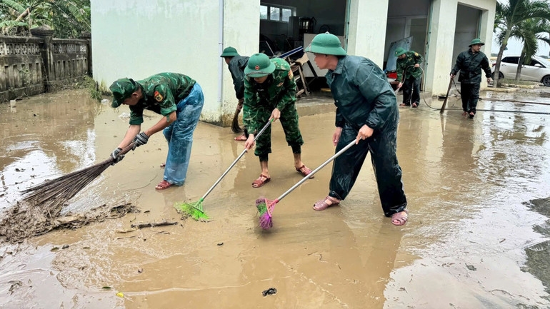 Bộ đội Biên phòng dọn dẹp vệ sinh ở xã Hòa Xuân, tỉnh Đắk Lắk sau mưa  lũ. Ảnh: nhandan.vn