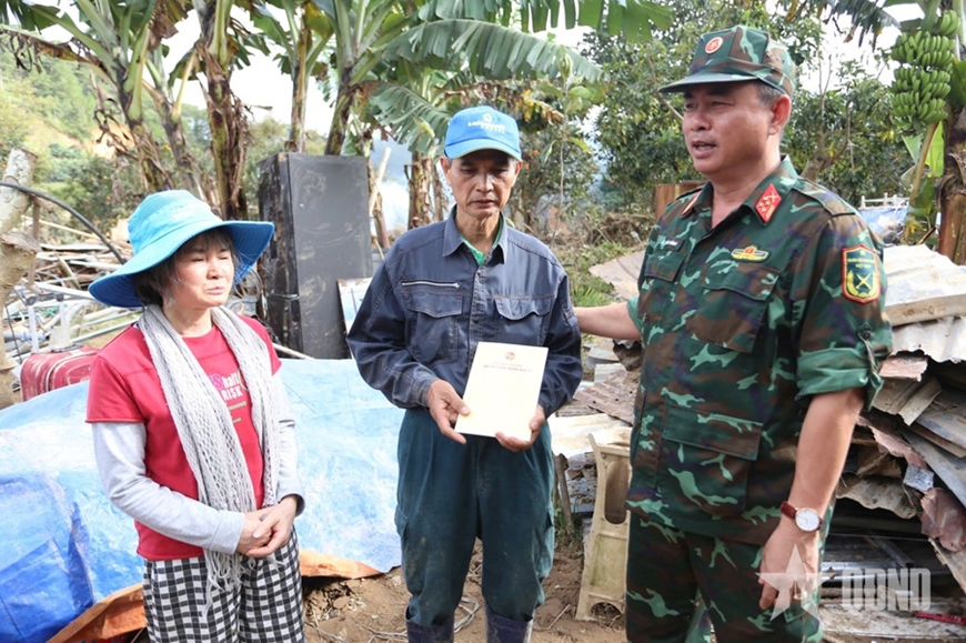 | Đại tá Lê Xuân Bình, Phó tư lệnh, Tham mưu trưởng Quân khu 7 động viên gia đình bị sập nhà trong đợt lũ vừa qua tại xã D’Ran, tỉnh Lâm Đồng. |