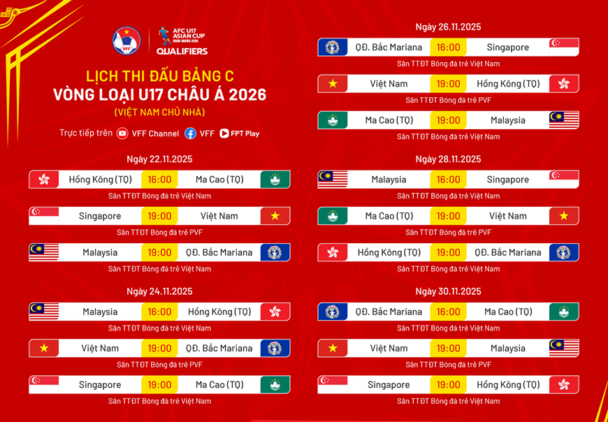 Vòng loại Giải bóng đá U17 châu Á 2026 quy tụ 38 đội bóng, được chia thành 7 bảng. U17 Việt Nam là chủ nhà của bảng C, lần lượt thi đấu với các đối thủ, đều vào lúc 19 giờ, gồm: U17 Singapore (ngày 22-11), U17 Quần đảo Bắc Mariana (ngày 24-11), U17 Hong Kong (Trung Quốc) vào ngày 26-11, U17 Ma Cao (Trung Quốc) ngày 28-11 và U17 Malaysia (ngày 30-11).